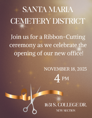 Join us as we celebrate the Santa Maria Cemetery District and the grand opening of their new office with an official Chamber Ribbon Cutting Ceremony! We invite the community to come out and show their support for this important community resource.